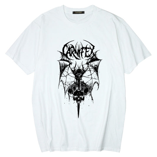 Looking for inspo? Here's a Dark Goth outfit idea you can try: Layer a mesh top with an oversize graphic tee, put a tight corset belt on top, some fishnet tights and platform boots - and voila!